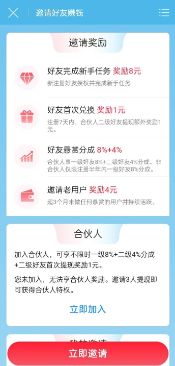 7、邀请好友:邀请一位有效好友能获得10%分成+1.3元现金奖励。